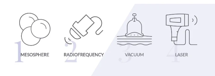 The combination of Bipolar Radiofrequency and LLLT Laser creates an INTENSE THERMAL HEAT in the connective tissues, including the fibrous septum. This promotes an increase in collagen deposits and cellular metabolism, leading to a considerable localised reduction in volume and skin looseness. The simultaneous function of the vacuum suction generates an immediate increase in blood circulation and of lymphatic drainage both of which are essential for improving overall health. The automatic rotation and sphere pressure of the new, ultra-modern mesosphere handpiece produces a micro-vibration that reaches the tissues directly, thus allowing complete processing of the skin and muscle.